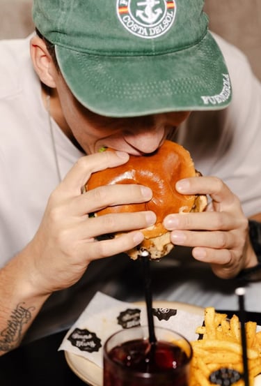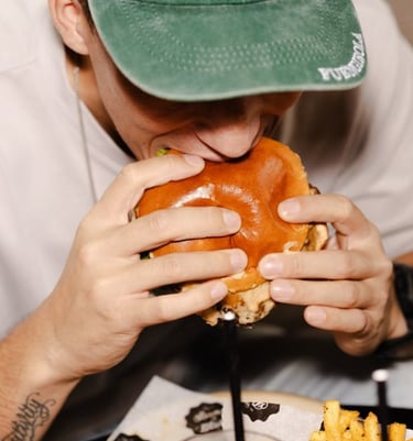 Steak haché, salade romaine, tomates cerises, pickles d'oignon rouge, concombres brûlés, cheddar rouge, sauce BBQ maison.