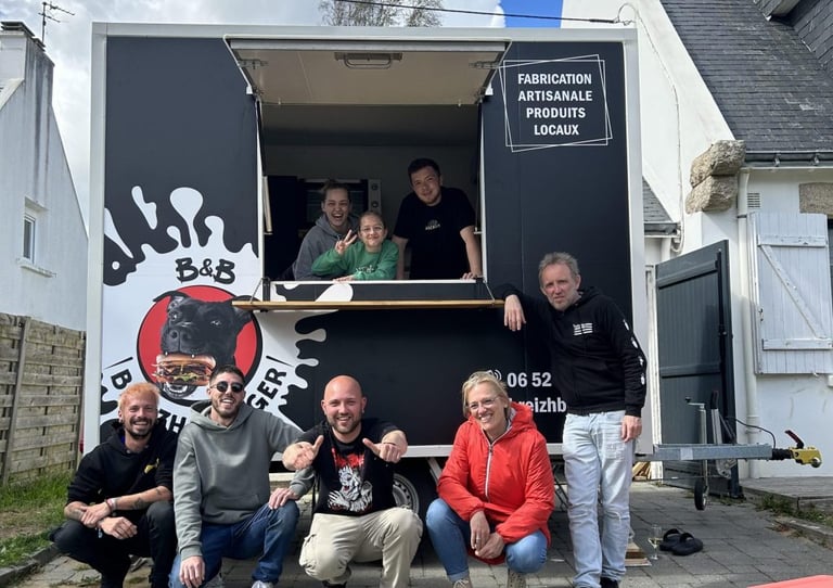 Steak haché, saucisse Bretonne, tomates cerises, pickles d'oignon rouge, concombres brûlés, salade romaine, tomme locale, confit d'oignons, sauce B&B.