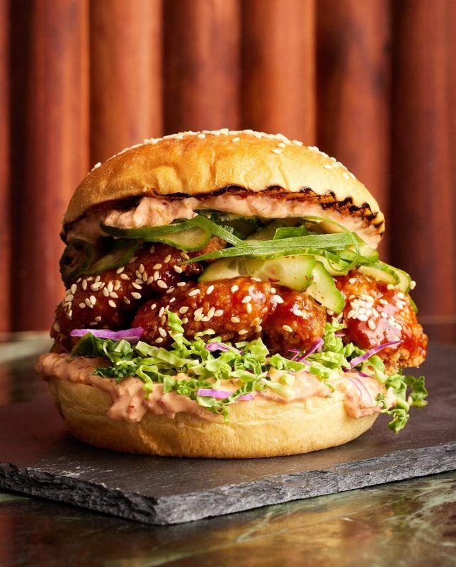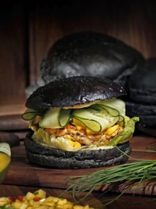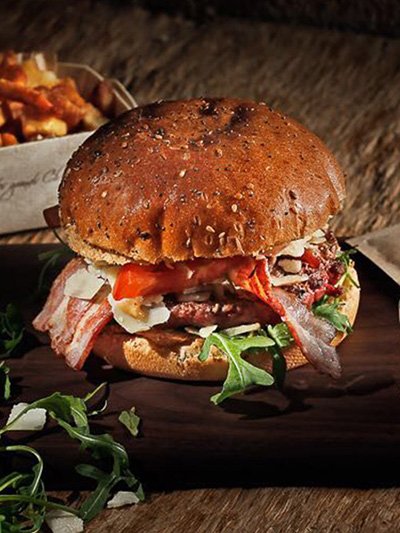 Steack haché, salade romaine, tomates cerises, pickles d’oignon rouge, concombre brûlés, cheddar rouge, sauce BBQ maison.